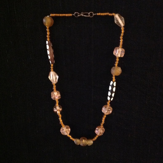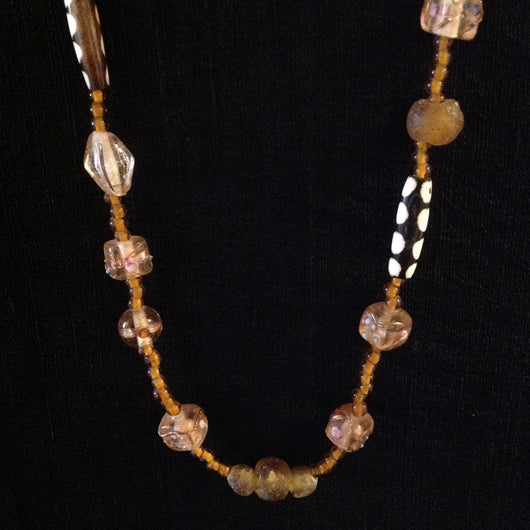 African amber glass trade beads with spotted bone oblongs, Murano glass beads and amber glass spacer beads strung with a sterling hook closure, 9" length.