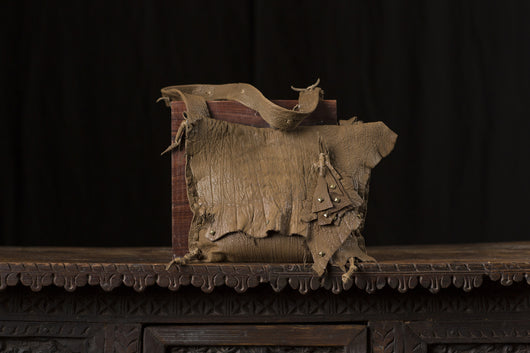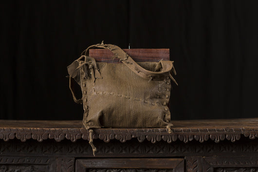 Olive green studded distressed leather bag, snap closure with inside pocket and under flap pocket. 11"x10", 17" handle.