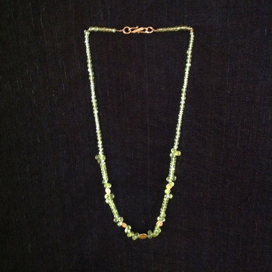 Peridot assemblage of faceted rondelles and teardrops with 24kt gold coins and hook closure, 11.75" necklace length.