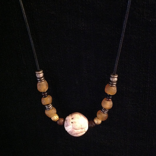 Rare carved bone focal bead 3/4" rabbit with long ears, amber beads with metallic spacer disks, wood and gold accent beads and sterling Hill Tribe beads strung on adjustable leather. As shown length is 11.5".