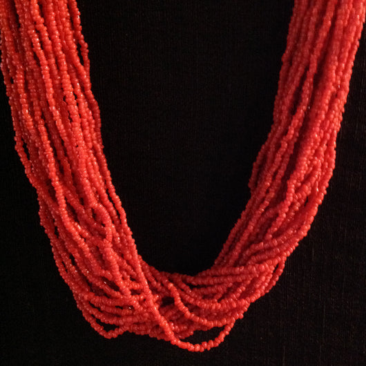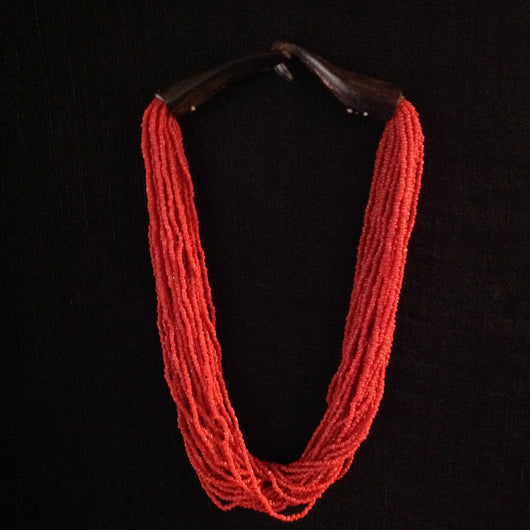 Fantastic thirty strand red coral necklace with horn closure, 11" length.