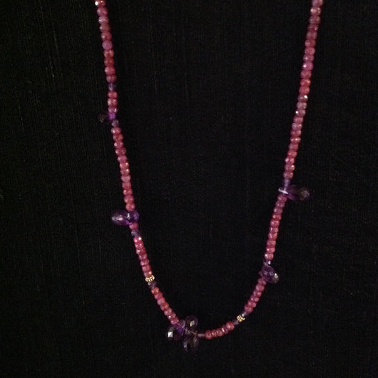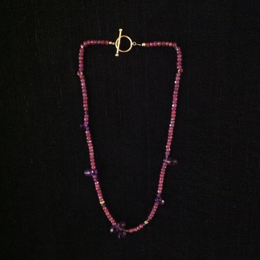 Faceted rubies and amethyst pear shapes on this necklace with two tiny shimmering gold beads, fastens with a 14k gold ring and toggle, 9.25" necklace length.