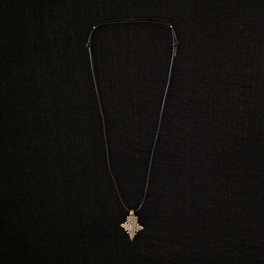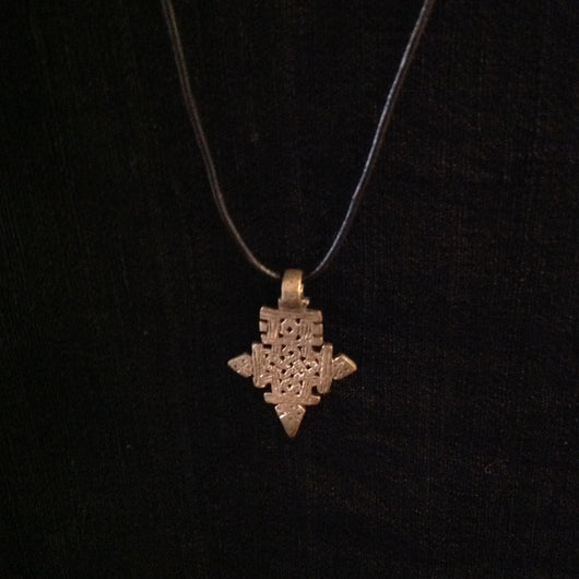 Silver metal coptic cross from Ethiopia, 500-1800's A.D., 1-7/8 x 1-1/4" cross strung on adjustable leather cord.