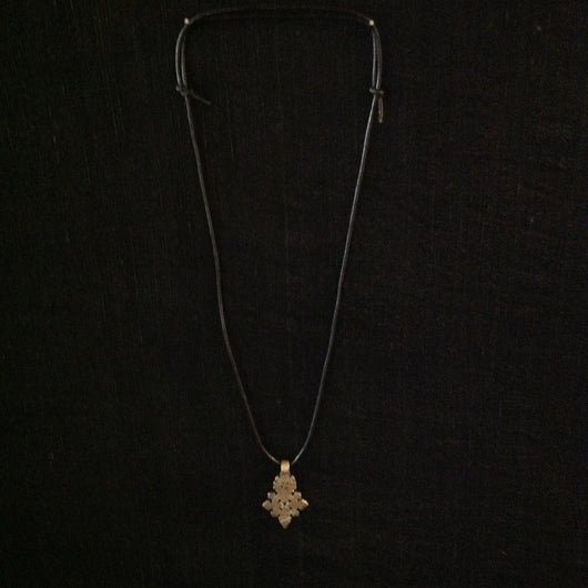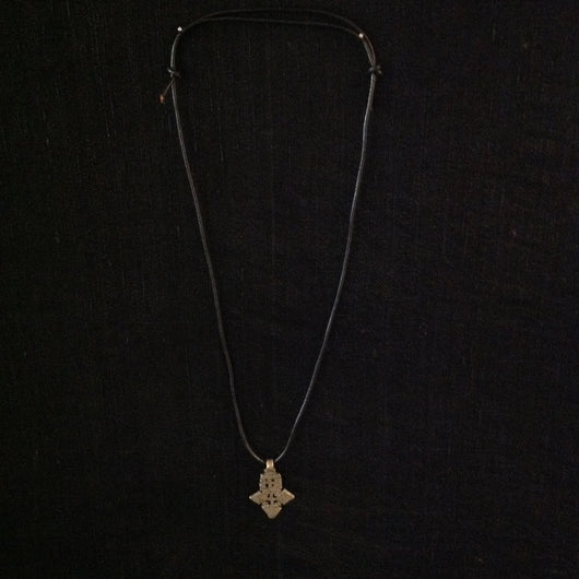Silver metal coptic cross from Ethiopia, 500-1800's A.D., 1-3/4 x 1-1/8" cross strung on adjustable leather cord.