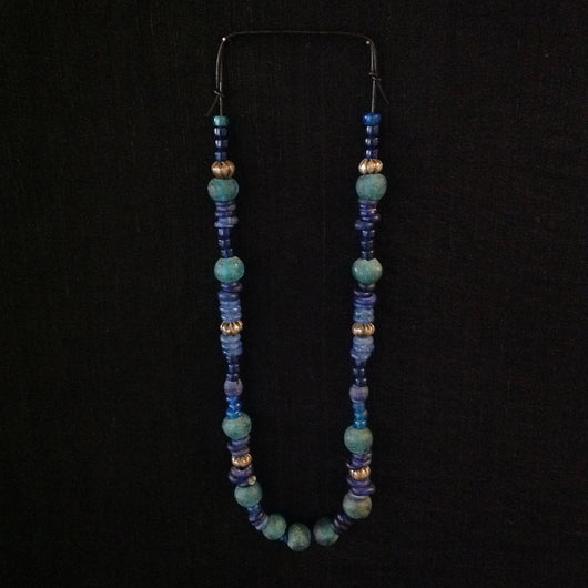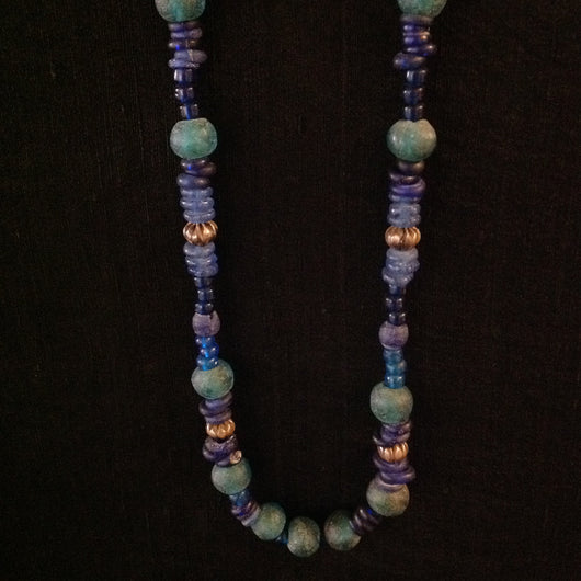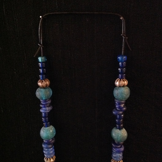 Sterling Hill Tribe beads from Ethiopia and African blue and green glass trade beads on adjustable leather cord, as shown 15" length.
