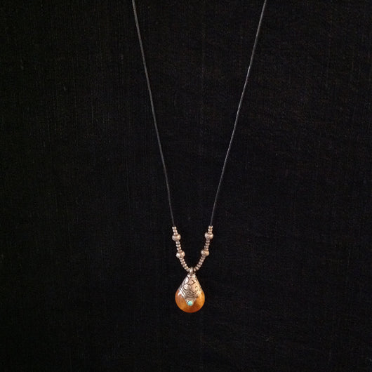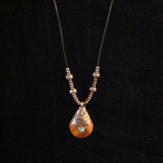 Sterling and amber with turquoise inlay trade bead accented with sterling Hill Tribe rotund almost rounds and tiny barrel beads. Necklace length as shown is 12.50".