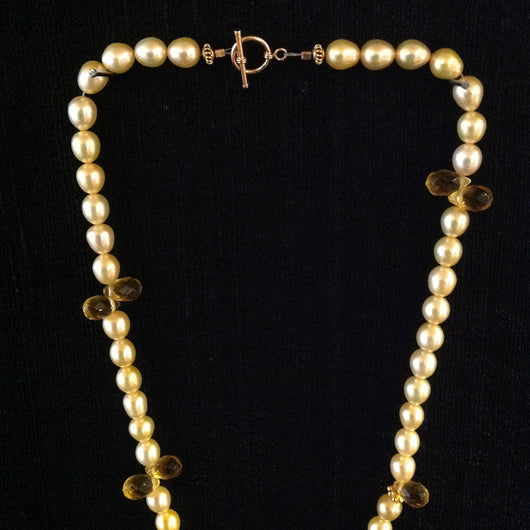 Yellow pearl ovals accented with faceted citrine ovals and gold spacer beads, with a large 20x13mm faceted citrine oval center bead, gold toggle clasp, 10" length.